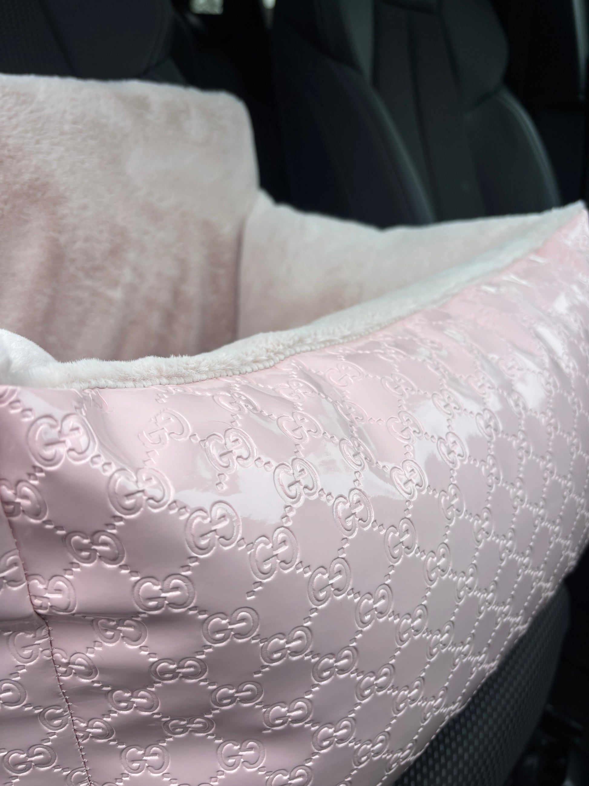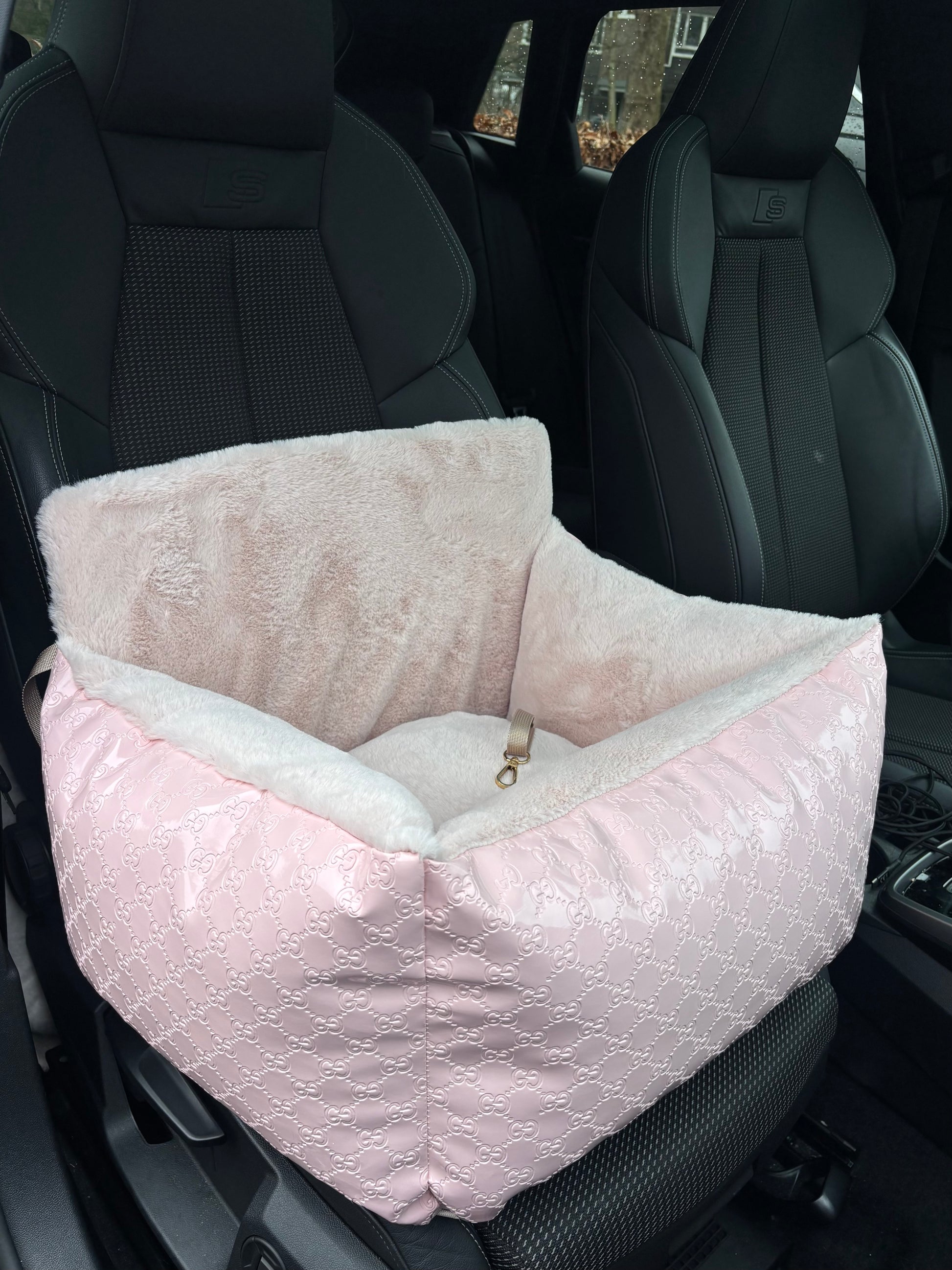 Prachtige custom made autostoel. Je kan de autostoel aan de stoel bevestigen en er zit een lijntje in om deze aan de tuig van je hond vast te maken.
