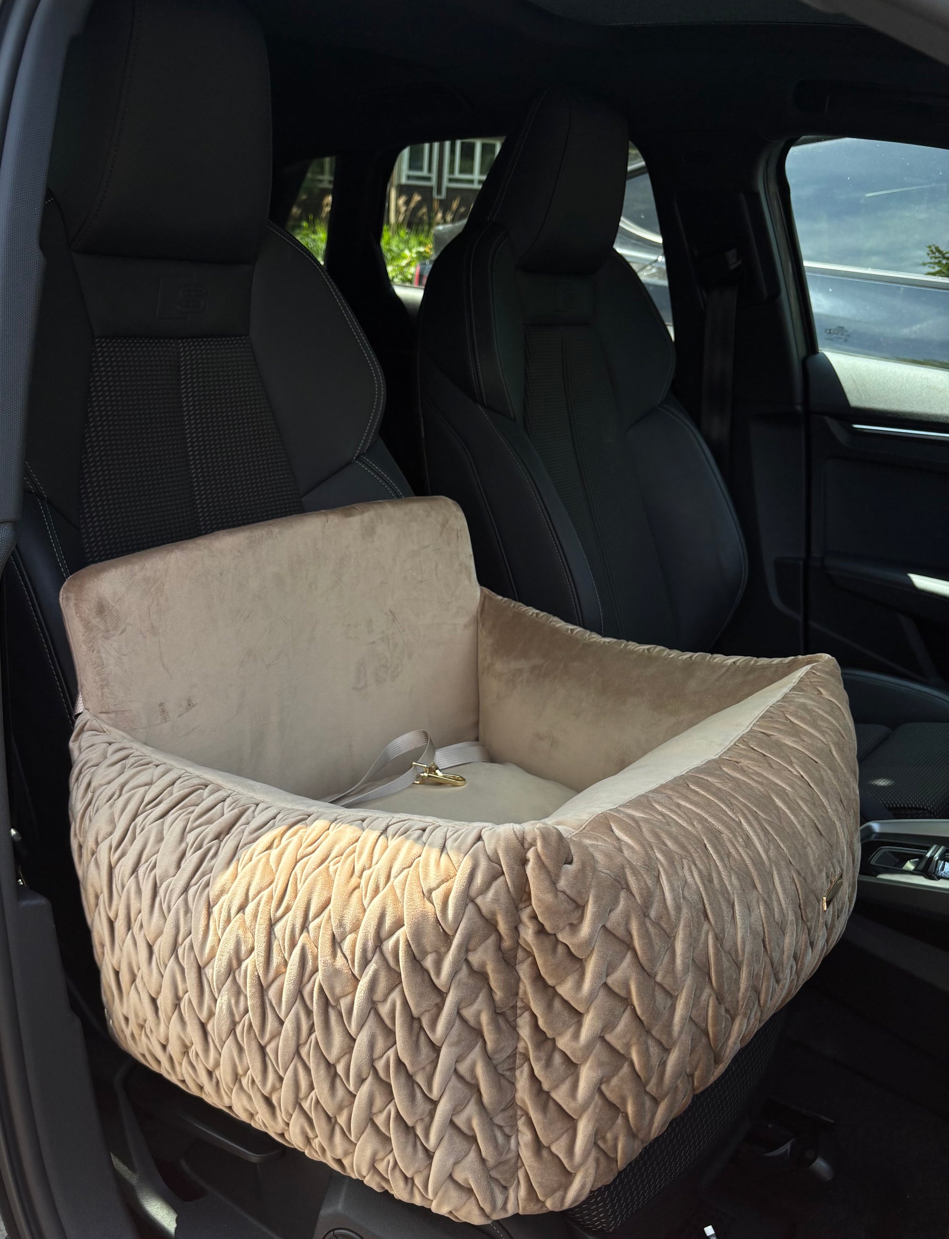 Prachtige autostoel met geweven print in velours beige/bruin. Je kan de autostoel aan de stoel bevestigen en er zitten 2 veiligheidslijntjes in om deze aan de tuig van je hond vast te maken.